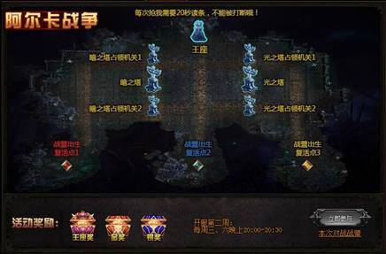 3.活动内容:击杀出生点怪物后进入战争场景,永久占领尖塔后夺取王冠