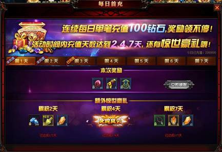 ◆ 新增每日充值奖励和累计充值次数奖励,增加奖励内容。(该活动为开服前7天的活动)