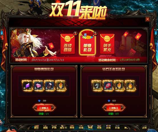 活动介绍:双十一活动期间连续登录三天,每天都有超值大礼包等你来拿